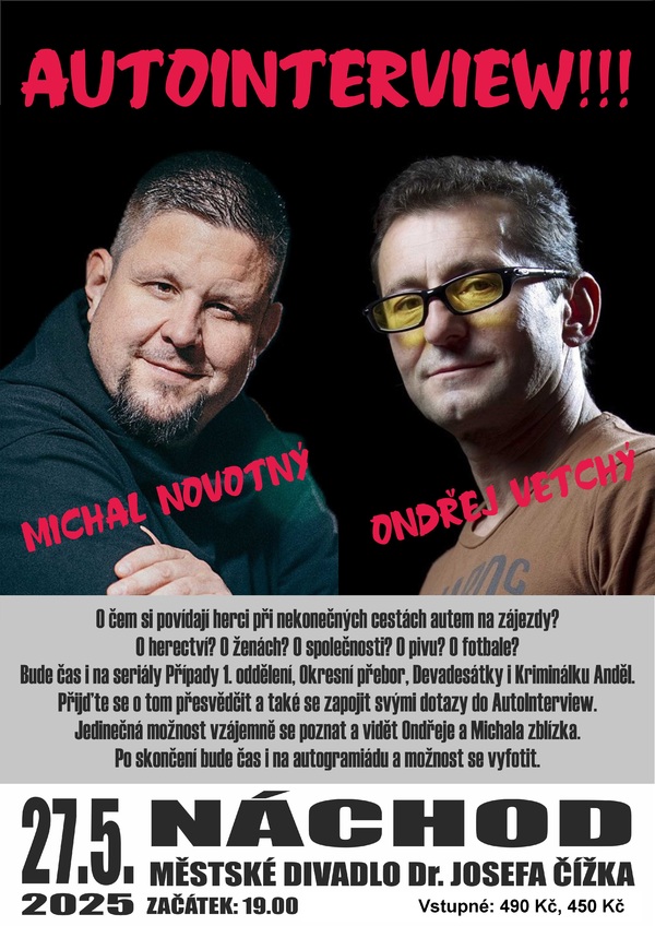 Městské divadlo Dr. J. Čížka v Náchodě vás zve v úterý 27. května 2025 od 19 hodin na nový zábavný pořad, který vás nechá nahlédnout do života dvou populárních herců - Ondřeje Vetchého a Michala Novotného.