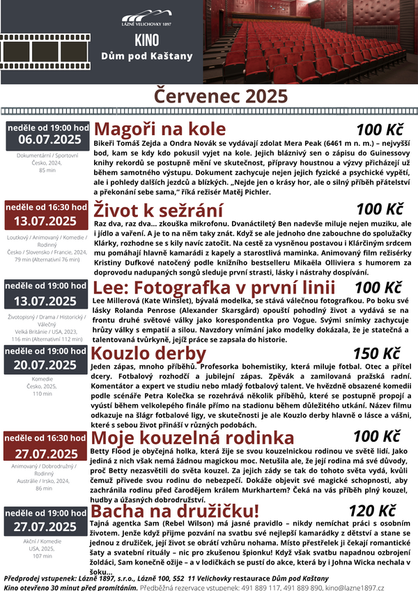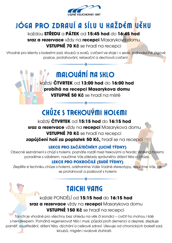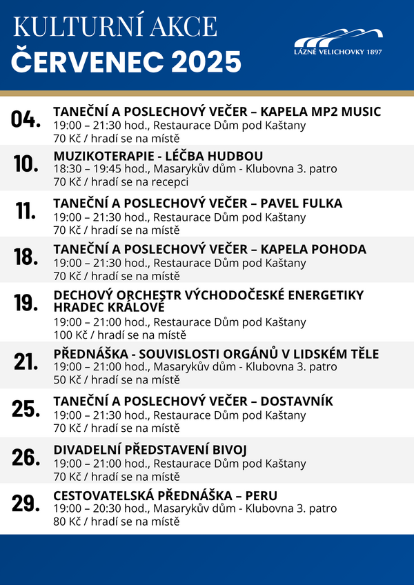 Červencové akce v lázních Velichovky 01. 07. 2025 - 31. 07. 2025 Zveme vás na bohatý kulturní program do lázní Velichovky.