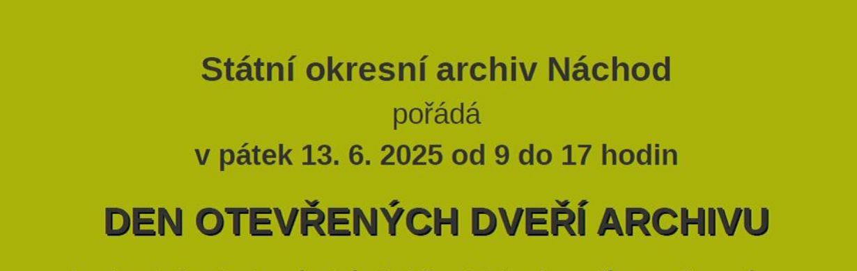 Státní okresní archiv Náchod vás srdečně zve na Den otevřených dveří, který se uskuteční v pátek 13. června 2025 od 9:00 do 17:00 hodin u příležitosti Mezinárodního dne archivů.