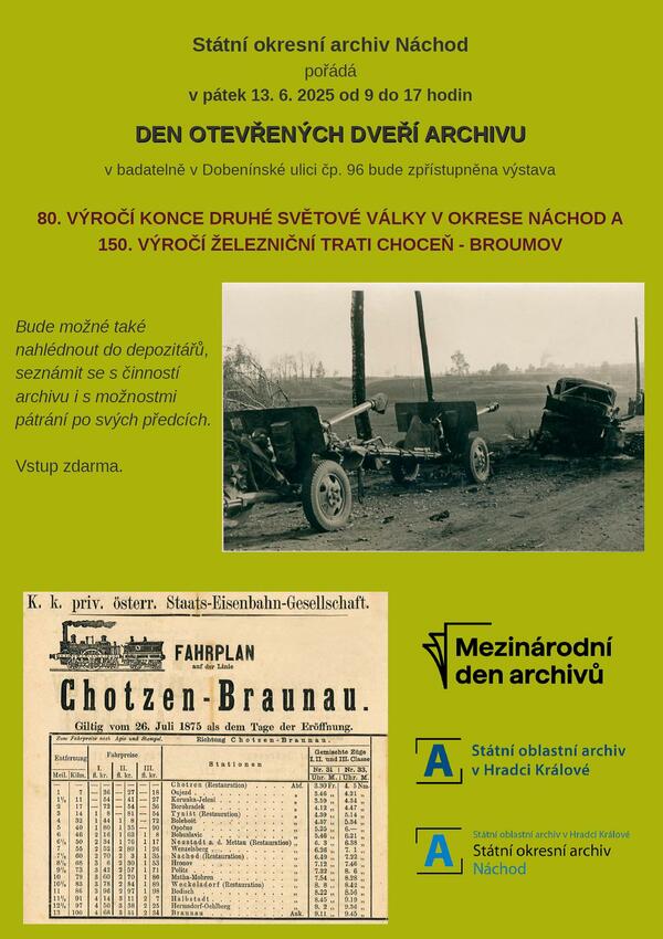V badatelně archivu na adrese Dobenínská ul. čp. 96, Náchod, bude instalována výstava věnovaná 80. výročí konce druhé světové války v okrese Náchod a 150. výročí železniční trati Choceň - Broumov.
