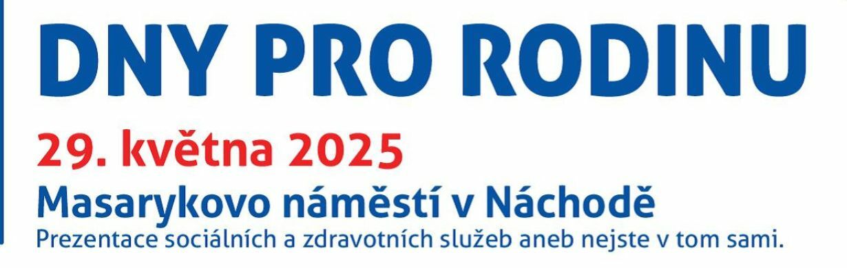Přijďte ve čtvrtek 29. května 2025 na Masarykovo náměstí v Náchodě a užijte si Dny pro rodinu - čeká vás bohatý program napříč generacemi - aktivity pro malé i velké, prezentace sociálních a lokálních služeb a ukázky aktivit dětí, přednášky o kyberbezpečnosti a bohaté občerstvení od místních podniků.