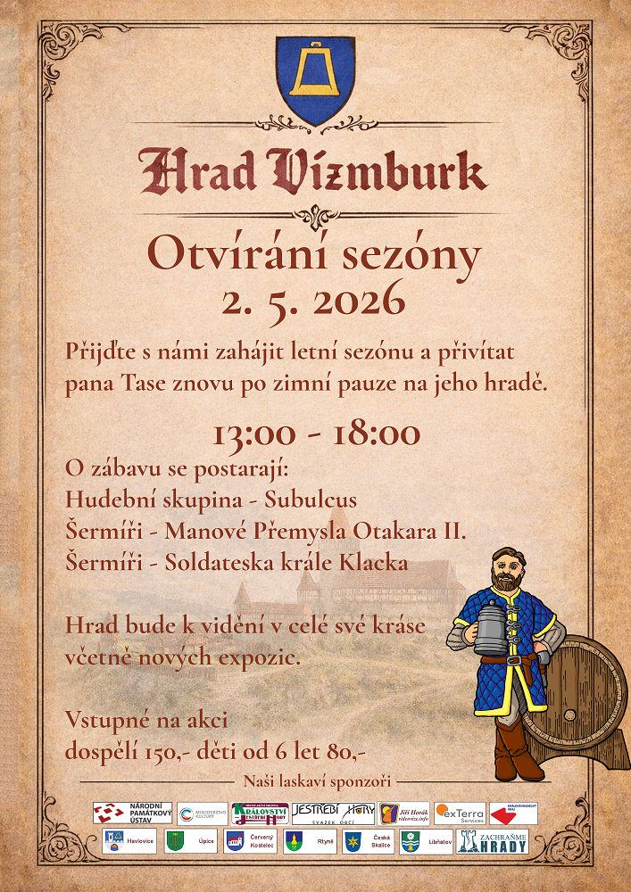 OTVÍRÁNÍ SEZÓNY NA HRADĚ VÍZMBURK 02. 05. 2026 - 02. 05. 2026 Srdečně zveme na společně strávené odpoledne ve stínu hvozdů na hradě Vízmburk. Soubory ke stažení Otvírání sezóny.png