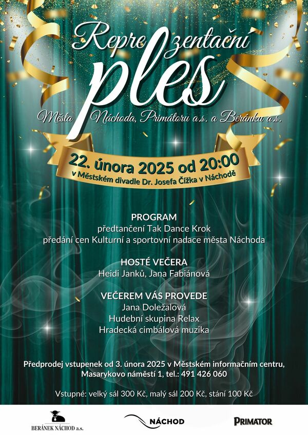 Město Náchod, Pivovar PRIMÁTOR a. s. a Beránek Náchod a. s. si vás dovolují pozvat na Reprezentační ples, který se uskuteční v sobotu 22. února. 2025 od 20 hodin v Městském divadle Dr. J. Čížka v Náchodě.