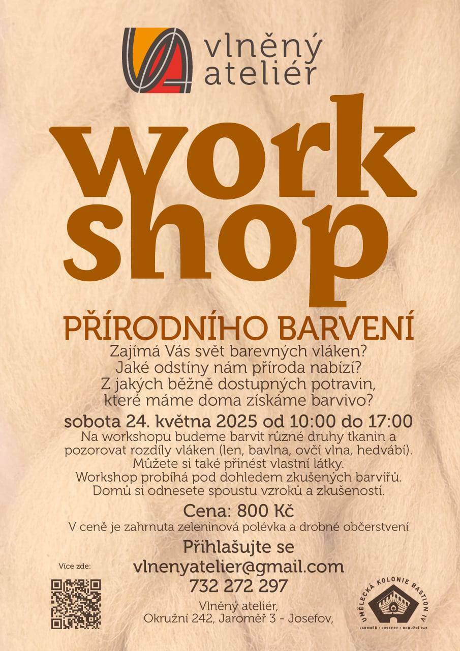 Zajímá Vás svět barevných vláken? Jaké odstíny nám příroda nabízí? Z jakých běžně dostupných potravin vyrobíte barvivo? Budeme barvit různé druhy tkanin. Můžete si přinést vlastní látku Akce se koná v sobotu 26. dubna 2025 od 10:00 do 17:00. Vstupné 800 Kč zahrnuje oběd a drobné občerstvení.