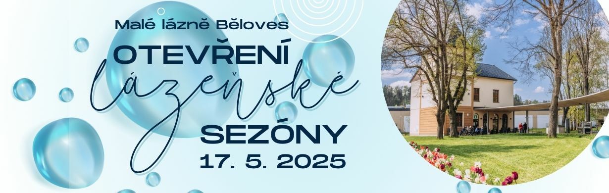 Zveme vás na slavnostní zahájení lázeňské sezóny v sobotu 17. května od 10:00 do 18:00. 13.00. do Malých lázní v Bělovsi. Čeká vás bohatý program plný hudby, zábavy a příjemné atmosféry. Hlavní program: 13:00–14:00 – Stavostrojka – známé muzikály a staré hity a populární dechová hudba 14:00 – Slavnostní zahájení s požehnáním pramenů 14:30–14:50 – Stavební práce 15:15–15:45 – Rytmizol (dechová hudba ZUŠ Náchod) 16:00–16:45 – Vystoupení populárních zpěváků ze Základní školy Náchod 16:45–17:00 – Břišní tanec – SVČ Déčko Náchod 17:15–18:15 - ETEREA – duo elektrických strunných nástrojů Doprovodný program: Sportovní a relaxační aktivity pro děti v centru SVČ Déčko Náchod. Doprava: Návštěvníkům se doporučuje používat veřejnou dopravu, protože počet parkovacích míst je omezený. Zajišťujeme občerstvení. Program se může změnit. Čekáme na vás!