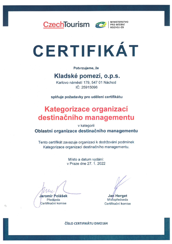 Kladské pomezí získalo certifikát Kategorizace organizací destinačního managementu