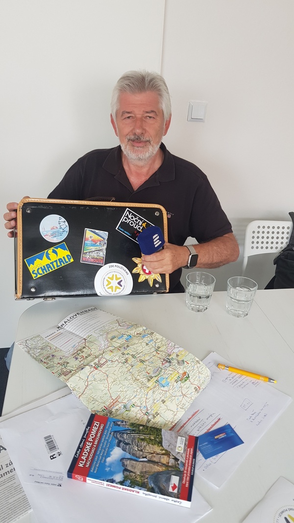 Publicista, novinář, rozhlasový a televizní zpravodaj Petr Voldán nedávno navštívil kancelář organizace cestovního ruchu Kladské pomezí sídlící v Náchodě. S sebou měl i svůj proslulý cestovatelský kufřík ozdobený různými samolepkami z jeho cest po Evropě. Z fotky pořízené bezprostředně po nalepení se můžete přesvědčit, že se tam vešla také samolepka Kladského pomezí.