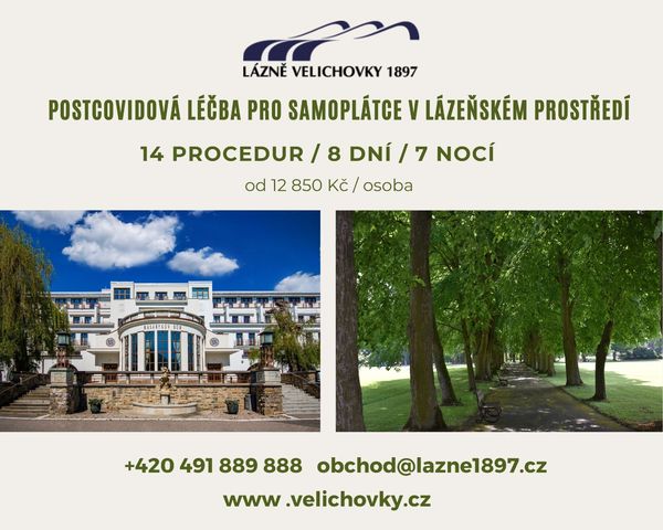 Pro posílení imunity a zmírnění příznaků po prodělané infekci COVID-19 mohou klienti v Lázních Velichovky 1897 využít POSTCOVIDOVOU LÉČBU PRO SAMOPLÁTCE V LÁZEŇSKÉM PROSTŘEDÍ na 8 dní/ 7 nocí se 14 procedurami.