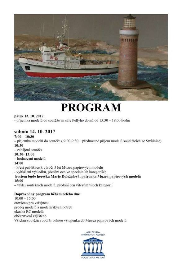 Srdečně vás zveme na modelářskou soutěž plastikových a papírových modelů, která proběhne už 14. října v Muzeu papírových modelů v Polici nad Metují. Máme velkou radost, že s námi stráví tento den herečka Marie Doležalová. Máme vypsáno řadu kategorií a speciálních cen včetně rodinné nebo ,,ženské" kategorie. Součástí dne bude také křest publikace vydané k pětiletému výročí otevření Muzea papírových modelů.