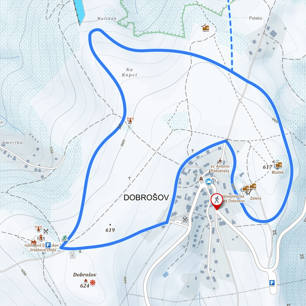 Začneme zlehounka výletem, který můžeme absolvovat na běžkách i pěšky. Máme před sebou 3,5 km dlouhý okruh na Dobrošově. Zaparkujeme u Jiráskovy turistické chaty. Od ní se vydáme vpravo, budeme tedy zpočátku následovat naučnou stezku Dobrošov.