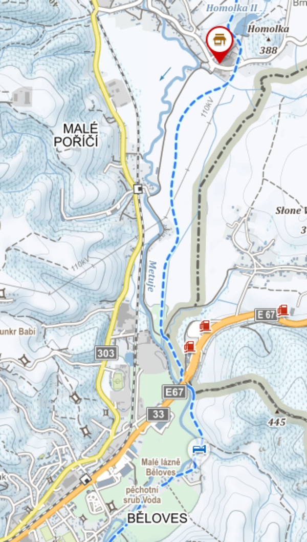 Náš druhý běžkařský výlet (3,5 km) tentokrát nebude okruhem, ale v cíli můžeme využít k návratu vlak. Začínáme na parkovišti firmy ATAS elektromotory ve Velkém Poříčí. Pohybujeme se v blízkosti cyklostezky u řeky Metuje. Ta nás vede do Malého Poříčí, kde si můžeme na chvíli odpočinout v přístřešku. Po občerstvení se čajem či kávou z termosky pokračujeme dále směrem k hraničnímu přechodu. Pomalu běžkujeme kolem rodinných domů v Bělovsi a přibližujeme se k našemu cíli. Vydáme se přes most do nového areálu Malých lázní Běloves.