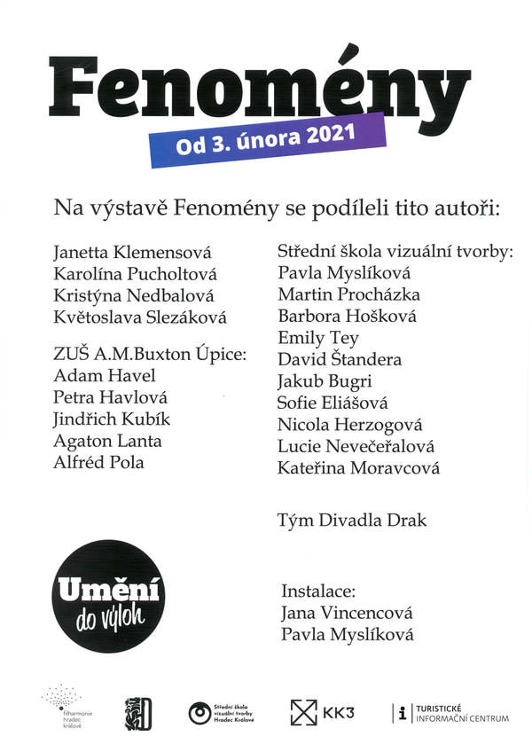 Výstava představuje fenomény české kultury Královéhradeckého kraje pohledem umělců, studentů a dětí. Kromě Boženy Němcové a bratrů Čapkových tu najdete díla spjatá s Divadlem Drak, Josefem Gočárem, Janem Kotěrou či Františkem Kupkou. Ve všední dny od 15 do 16 hodin navíc výstavu doprovází reprodukovaná hudba v podání Filharmonie Hradec Králové.Turistické informační centrum Hradec Králové na Eliščině nábřeží má výlohy plné světových osobností Královéhradeckého kraje! Najdete mezi nimi i zástupce Kladského pomezí - Boženu Němcovou a bratry Čapkovy.
