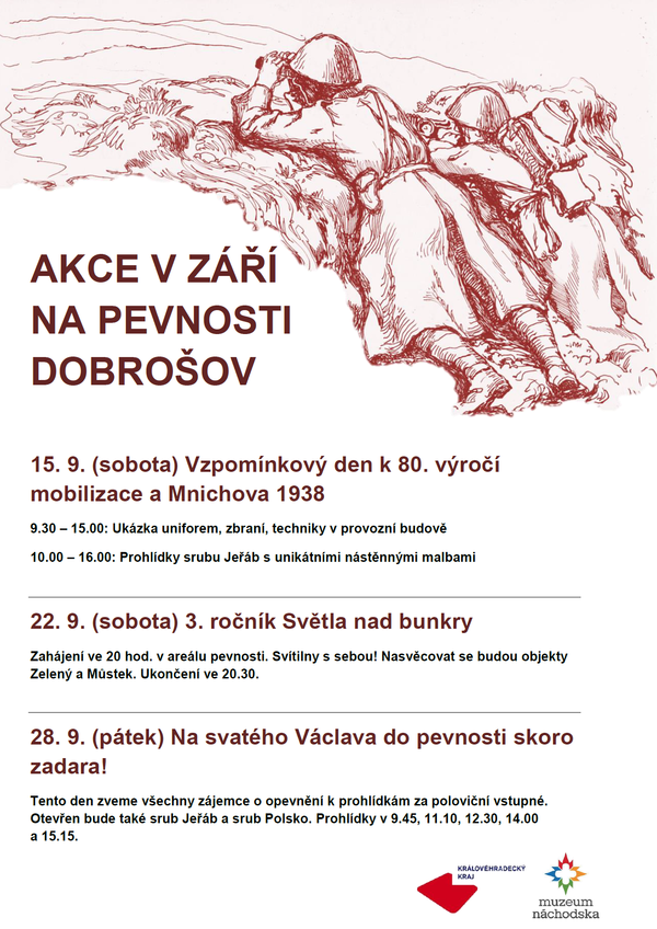 Velkolepá akce k výročí mnichovské dohody a mobilizace československé armády, světla nad bunkry a možnost navštívit na sv. Václava pevnost za poloviční vstupné. To vše vás čeká v září na pevnosti Dobrošov.