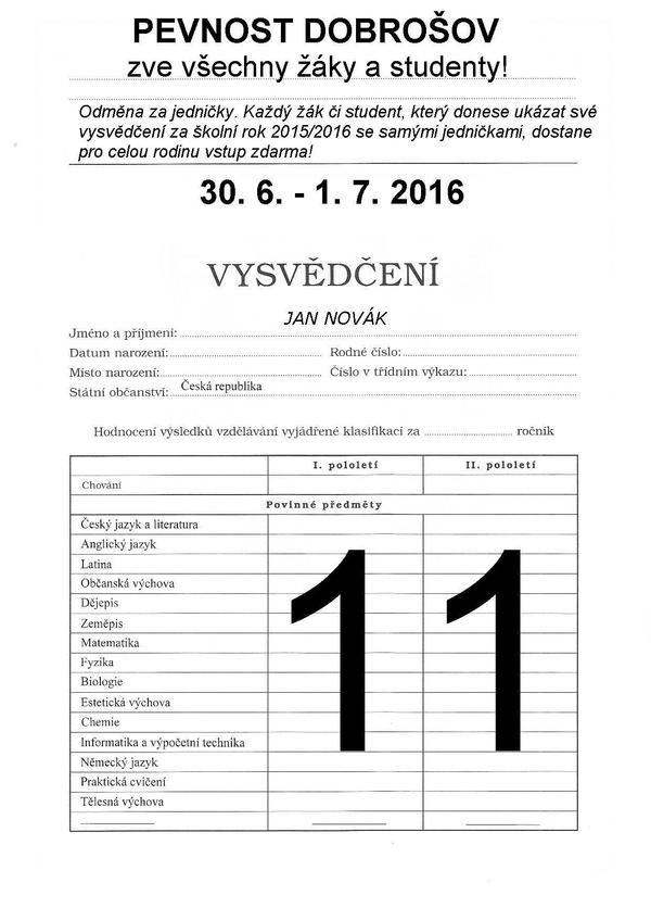 Každý žák či student, který v termínu 30.6. - 1.7.2016 donese ukázat své vysvědčení za školní rok 2015/2016 se samými jedničkami, získá vstup pro celou rodinu zdarma!