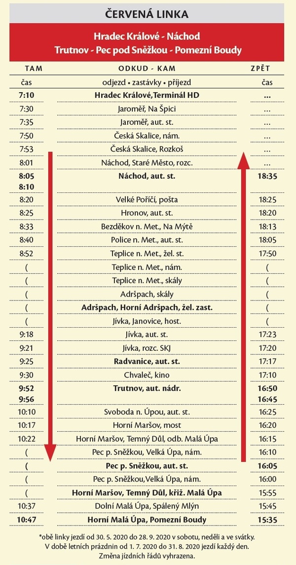 Od pondělí 27. 7. 2020 dochází ke změně trasy červené linky cyklobusů, vedoucí z Hradce Králové, přes Náchod, Polici nad Metují, Teplice nad Metují a Trutnov, až na Pomezní boudy.Z důvodu opětovné uzavírky mezi Teplicemi a Adršpachem nebude linka zajíždět do Adršpachu. Namísto toho, budou opět obsluhovány zastávky v Jívce a v Radvanicích.