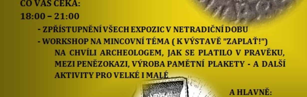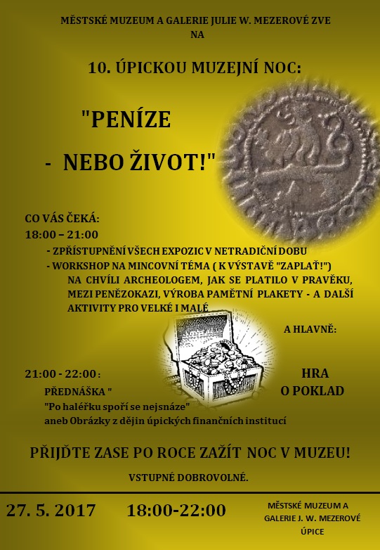 Městské muzeum a galerie Julie W. Mezerové srdečně zve na jubilejní 10. ÚPICKOU MUZEJNÍ NOC, která se letos koná ve znamení peněz. A co Vás čeká? Kromě tradičního zpřístupnění všech expozic v netradičním čase se můžete těšit na zážitkový workshop s názvem "Peníze - nebo život!" připravený k právě probíhající výstavě "Zaplať"!: malí i velcí si budou moci na vlastní kůži vyzkoušet práci jednotlivých profesí ve středověké mincovně, zkusí si, jaké je to mezi penězokazi, budou moci vyzkoušet, jak zaplatit v pravěku, budeme razit mince, odlévat a zdobit pamětní plakety a mnoho dalšího. Aktivity jsou připraveny i pro nejmenší návštěvníky.