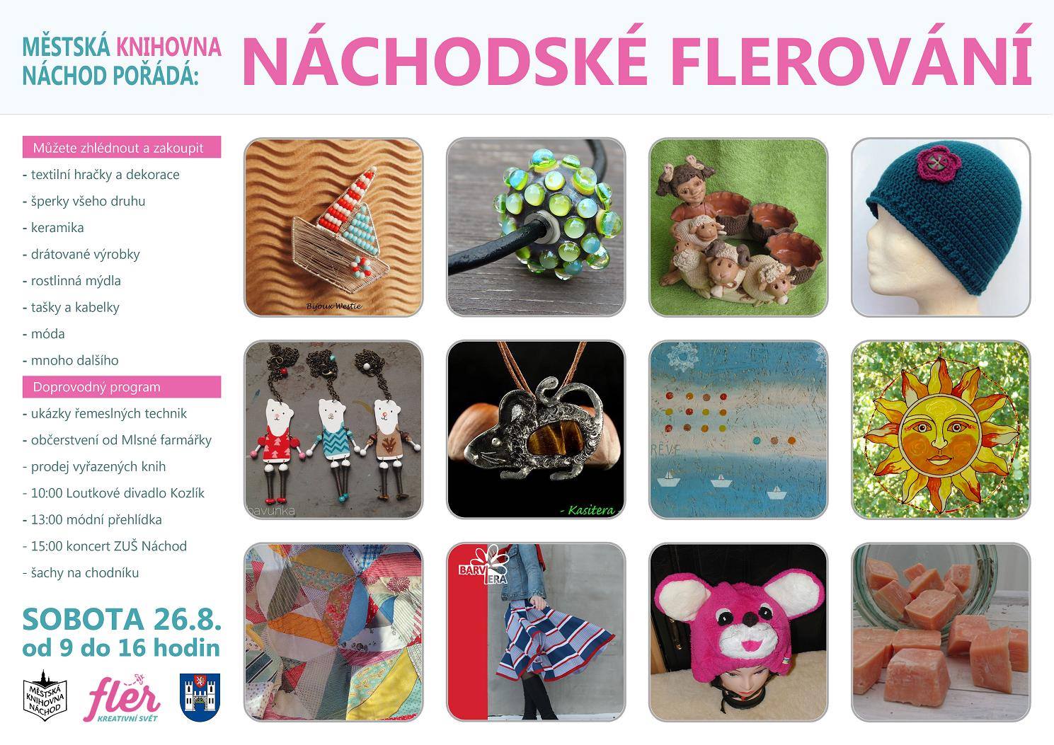 Na sobotu 26. srpna připravuje Městská knihovna již 5. Náchodské flerování. Po celý den, od 9 do 16 hodin, si můžete v hale a na dvorku knihovny prohlédnout a nakoupit různé výrobky od prodejců z Fleru - textilní hračky a dekorace, šperky všeho druhu, keramiku, drátované výrobky, tašky, kabelky, módu a mnoho dalšího. Ani letos nebude chybět divadelní představení pro děti (v 10 hodin), módní přehlídka (ve 13 hodin) nebo koncert ZUŠ Náchod (v 15 hodin). O občerstvení se postará Mlsná farmářka. Budete-li mít chuť a čas, určitě přijďte!