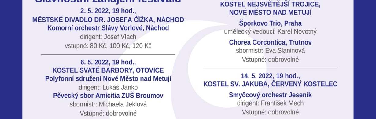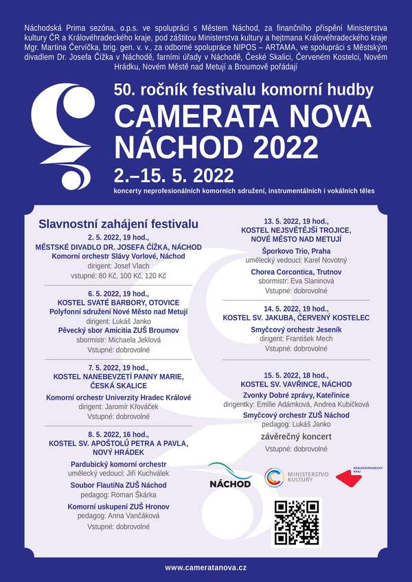 Pořádá Náchodská Prima sezóna, o.p.s. ve spolupráci s Městem Náchod, za finančního přispění Ministerstva kultury ČR a Královéhradeckého kraje, pod záštitou Ministerstva kultury a hejtmana Královéhradeckého kraje Mgr. Martina Červíčka, brig. gen. v. v., za odborné spolupráce NIPOS - ARTAMA, ve spolupráci s Městským divadlem Dr. Josefa Čížka v Náchodě, farními úřady v Náchodě, České Skalici, Červeném Kostelci, Novém Hrádku, Novém Městě nad Metují a Broumově.