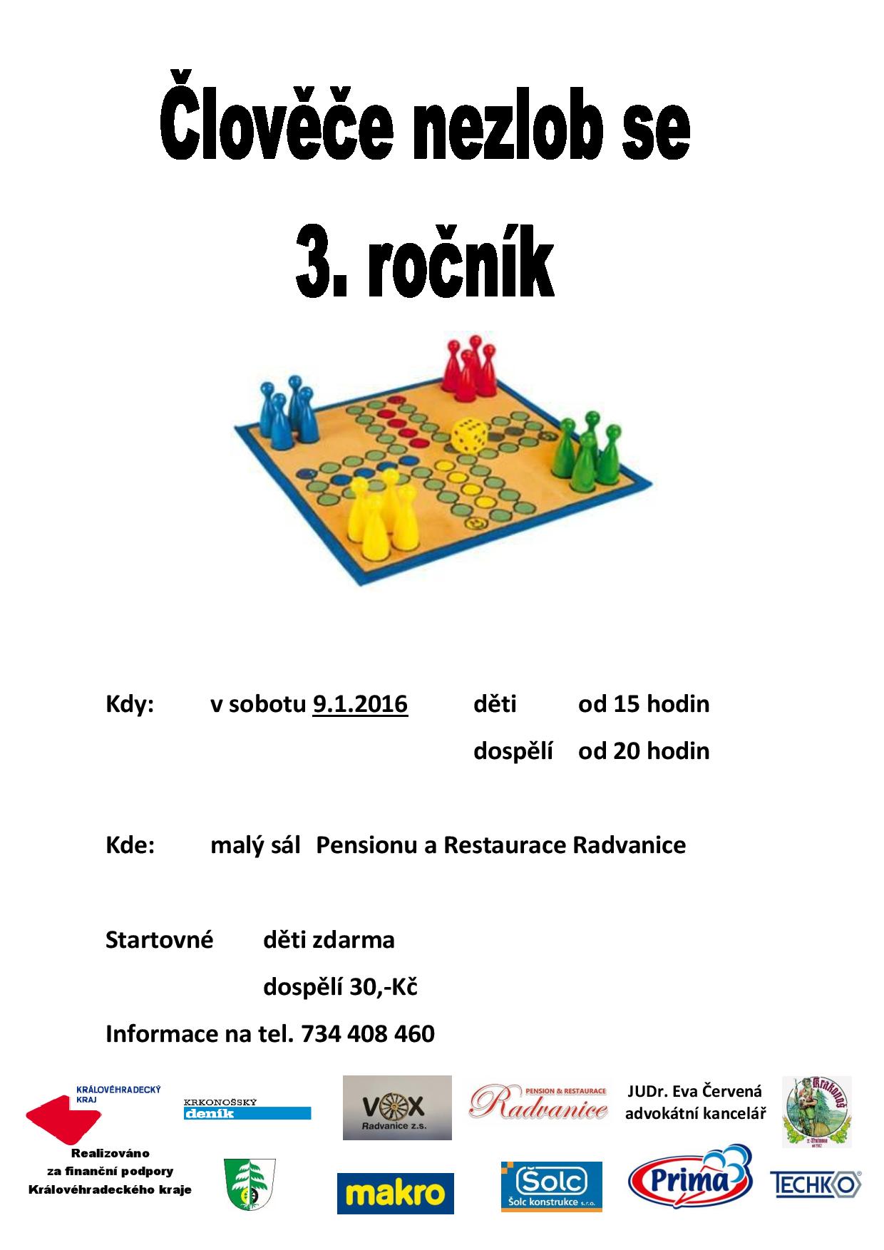 hře ,,Člověče, nezlob se!". Od 15 hod pro děti, od 20hod pro dospělé.