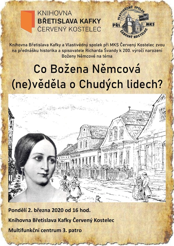 Knihovna Břetislava Kafky a Vlastivědný spolek při MKS Červený Kostelec zvou na přednášku historika a spisovatele Richarda Švandy k 200. výročí narození Boženy Němcové.