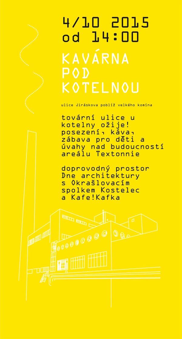 Ve stejný den ožije i ulice u kotelny. Čeká vás posezení, káva, zábava pro děti a úvahy nad budoucností areálu Textonnie. Přijďte si s námi užít výjimečné atmosféry v tomto místě. Prostor bude připraven od 14 hodin v odbočce z ulice Jiráskovi poblíž kotelny a vysokého komína továrny.