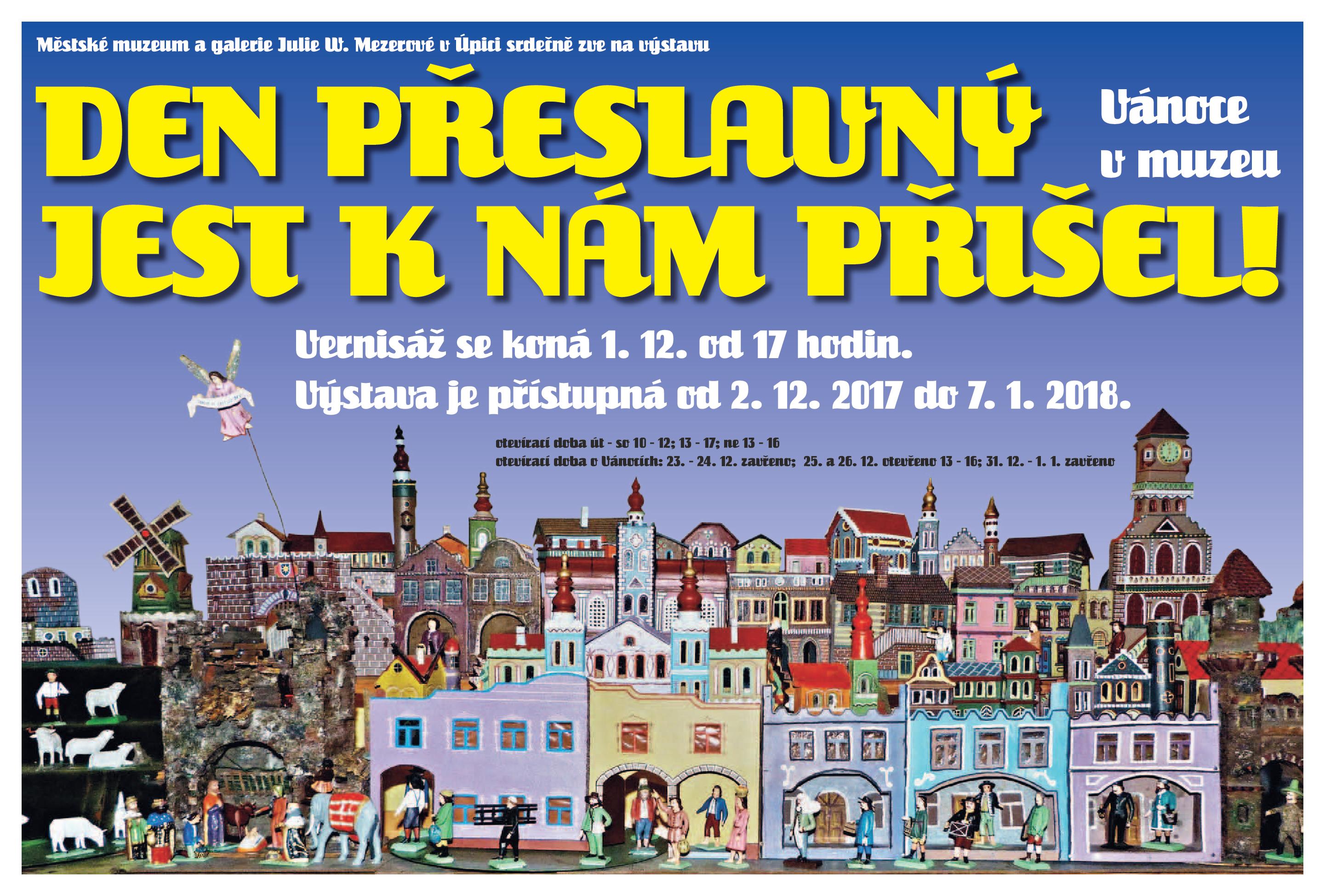 Městské muzeum a galerie JWM srdečně zve na tradiční vánoční výstavu, letos s názvem vypůjčeným z jedné ze starých českých vánočních koled - Den přeslavný jest k nám přišel! Těšit můžete na výpravu za taji vánočního pečení našich pra-prababiček, za nimiž se vypravíme do časů starého Rakouska a první československé republiky, a především na betlémy, bez nichž by naše Vánoce Vánocemi snad ani nebyly. I letos jsou připravena velká překvapení - betlémy papírové, vyřezávané, pohyblivé a dokonce i velká scéna Narození Páně patřící kostelu v Markoušovicích, zapůjčená díky ochotě úpické římskokatolické farnosti a obce Velkých Svatoňovic.