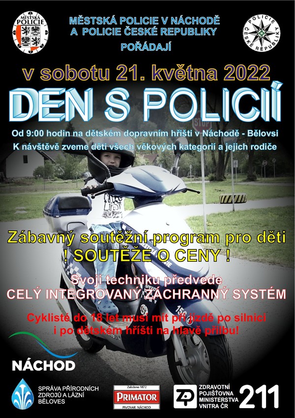 Městská policie Náchod společně s Policií ČR srdečně zve po dvouleté odmlce všechny malé i velké zájemce na tradiční oblíbenou akci Den s Policií, která se uskuteční 21. května 2022 na Dětském dopravním hřišti v Náchodě-Bělovsi.