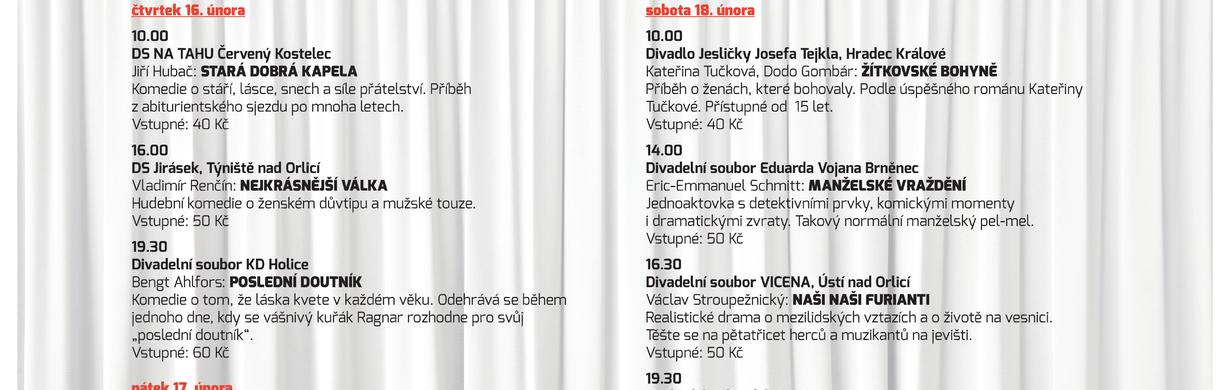 Ve dnech 16. - 19. 2. 2017 se uskuteční v Divadle J. K. Tyla v Červeném Kostelci již 20. ročník DIVADELNÍHO FESTIVALU. Tento festival pořádá Impuls Hradec Králové, Městské kulturní středisko Červený Kostelec, Divadelní soubor DS NA TAHU při MKS Červený Kostelec a Volné sdružení východočeských divadelníků za finanční podpory Královehradeckého kraje a Ministerstva kultury ČR.