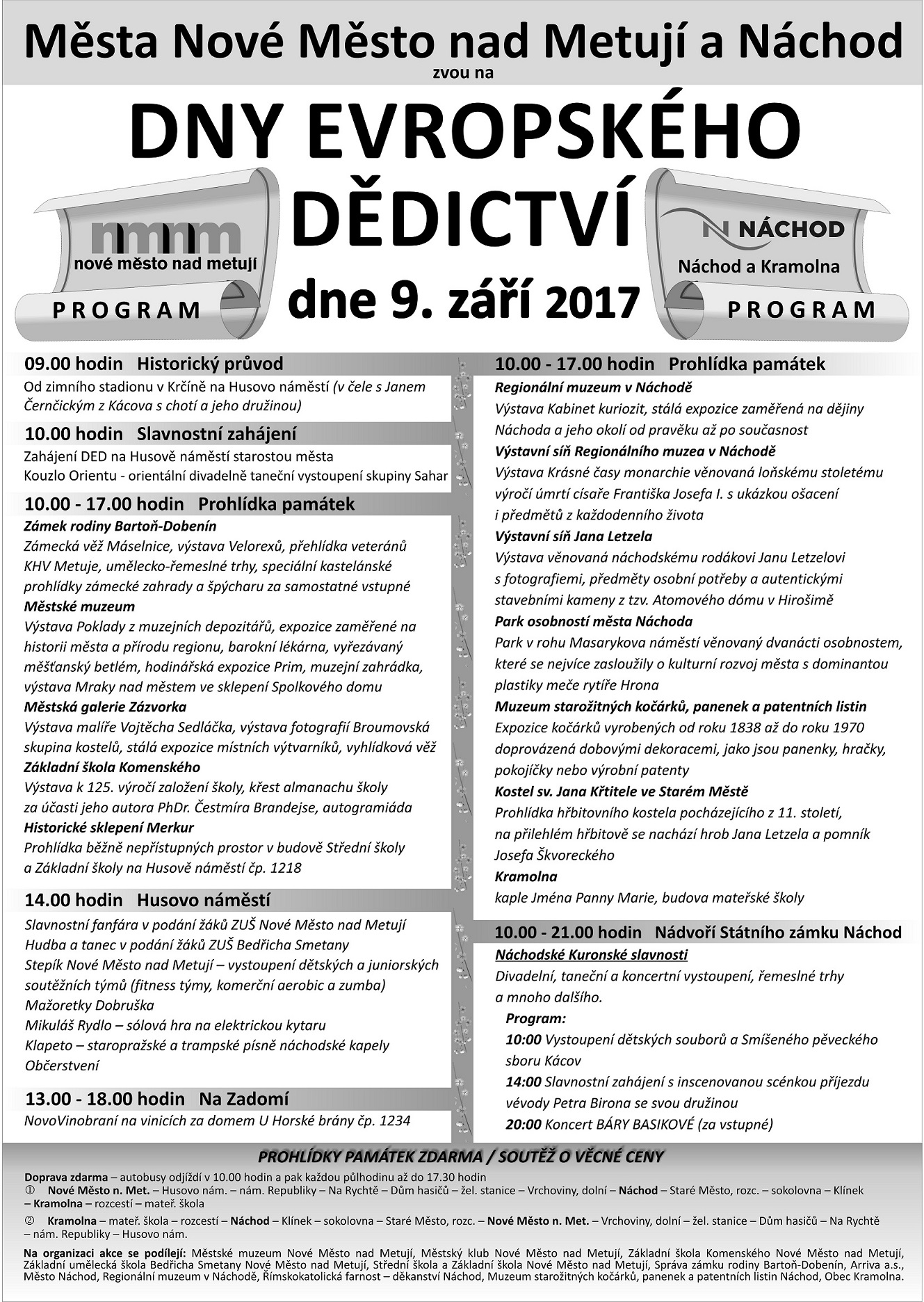 Dny evropského dědictví se konají 9. 9. 2017 v Náchodě, Nové Městě nad Metují a Kramolně. V Náchodě bude k vidění kostel sv. Jana Křtitele ve Starém Městě, Muzeum kočárků, panenek a patentních listin, Park u města Prahy – Park osobností, Výstavní síň Jana Letzla v recepci Hotelu U Beránka, Výstavní síň Regionálního muzea či jeho stálá expozice na Masarykově náměstí. Vrcholem pak budou Náchodské Kuronské slavnosti na nádvoří zdejšího zámku. Nové Město nad Metují pak láká na Městské muzeum, Městskou galerii Zázvorka, zámeckou věž Máselnice nebo Základní školu Komenského. Již tradiční akcí jsou zámecké trhy a novoměstské vinobraní. V obci Kramolna bude k vidění kaple Jména Panny Marie. Po celý den bude na trase Nové Město nad Metují – Náchod – Kramolna kyvadlově v půlhodinových intervalech jezdit bezplatná autobusová doprava s možností neplacené návštěvy uvedených památek a akcí.