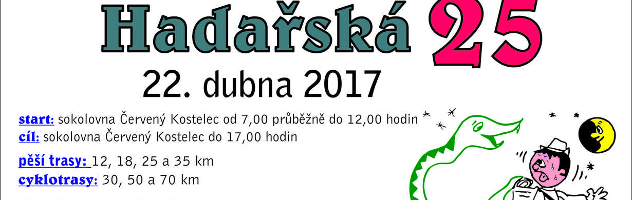 Více informací na www.kct.cervenokostelecko.czTakže vám nezbývá nic jiného než v sobotu 22. dubna 2017 vstát a přijít k sokolovně v Červeném Kostelci na start Hadařské 25, který je od 7:00 hodin průběžně. To znamená, že větší spáči mohou startovat třeba v poledne. Každý si zvolí takovou délku trasy, aby přišel do cíle pochodu k sokolovně v Červeném Kostelci nejdéle do 17:00 hodin, kdy celá akce končí.