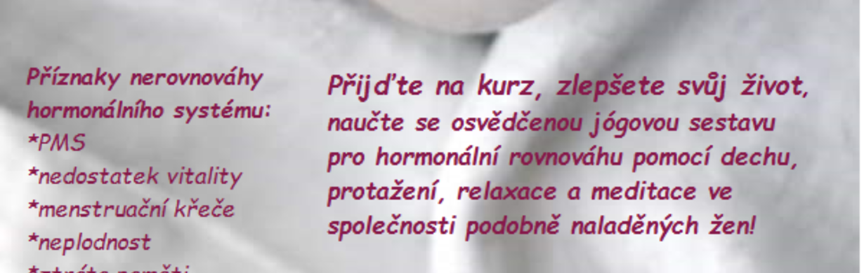 Zveme Vás na šestidenní kurz s Věrkou Popelkovou, který je zaměřen na nerovnováhu hormonálního systému. Naučíte se jógovou sestavu pro obnovení rovnováhy pomocí dechu, protažení, relaxace a meditace. Cena: 90 Kč/setkání, 490 Kč/celý kurz. Kurz se koná od 18 do 19.15 hodin, a to ve středu: 18. listopadu, 2. prosince, 16. prosince, 13. ledna, 27. ledna, 10. února.