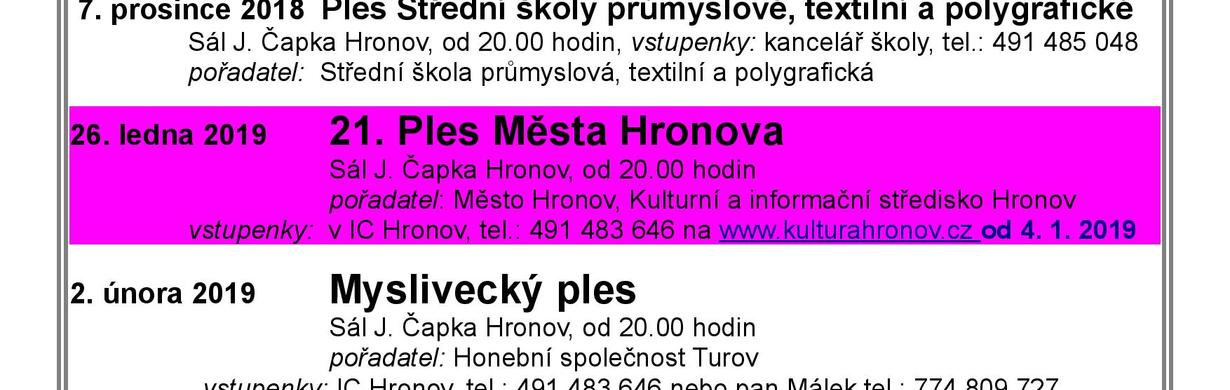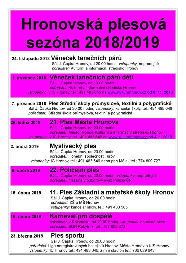 Plesová sezóna 2018/2019 Více informací na tel. čísle 491 483 646 nebo na www.kulturahronov.cz |