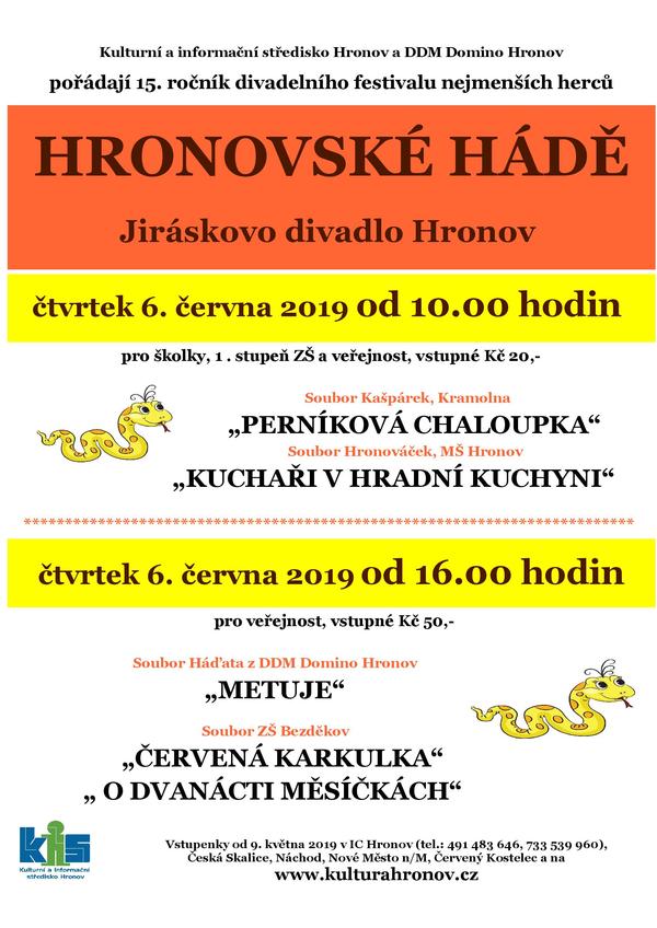 Vystoupí čtyři soubory: Kašpárek - Kramolna, Hronováček - MŠ Hronov, Háďata z DDM Domino Hronov a ZŠ Bezděkov.