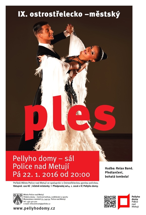 Město Police nad Metují Vás srdečně zve na IX. Ostrostřelecko - městský ples, který se bude konat v pátek 22.1.2016 od 20:00 hodin na sále Pellyho domů. Hudba Relax Band, předtančení, bohatá tombola. Předprodej vstupenek v polickém informačním centru (491 421 501).