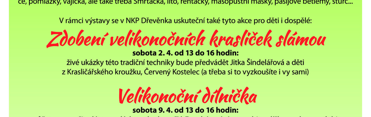 V rámci velikonoční výstavy se v NKP Dřevěnka uskuteční také tyto akce pro děti i dospělé: