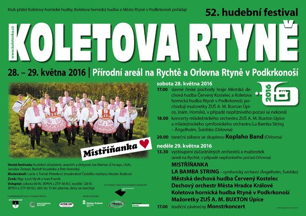 52. ročník festivalu dechových orchestrů - vystoupí Mistříňanka, La Bamba String (Švédsko), Městská dechová hudba Červený Kostelec, Dechový orchestr města Hradec Králové, mládežnický dechový orchestr a mažoretky ZUŠ A. M. Buxton Úpice a Koletova hornická hudba. K tanci zahraje Koplaho Band.