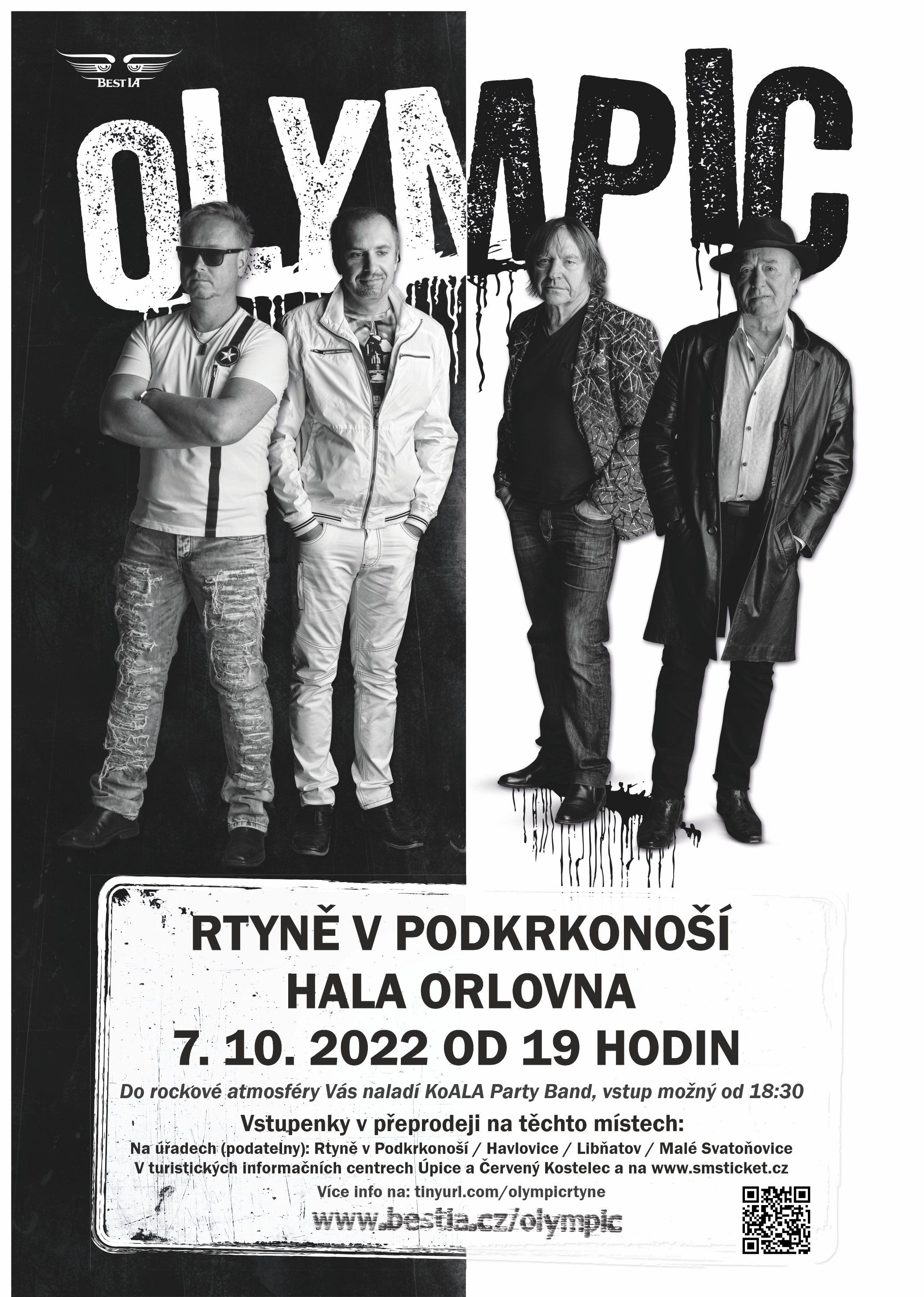 Zveme vás na koncert legendární rockové kapely Olympic, který se uskuteční v pátek 7. října 2022 od 19 hodin v hale Orlovna ve Rtyni v Podkrkonoší.