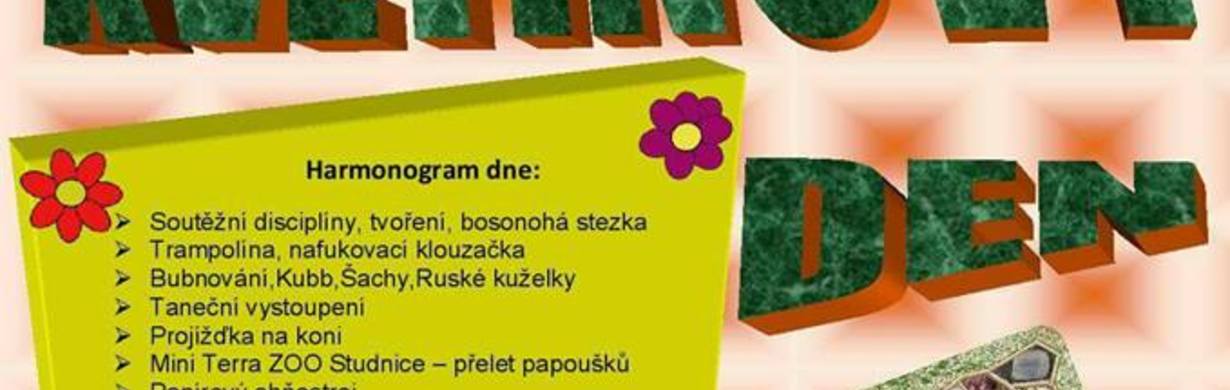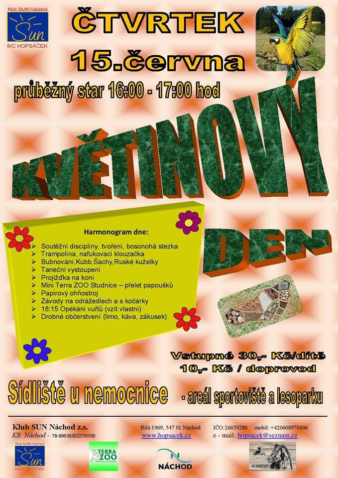 Klub SUN Náchod pořádá ve čtvrtek 15. června Květinový den, jehož součástí jsou soutěžní disciplíny, tvoření, bosonohá stezka, trampolína, nafukovací klouzačka, bubnování, kubb, šachy, ruské kuželky, taneční vystoupení, mini Terra Studnice - přelet papoušků, papírový ohňostroj, opékání buřtů a další.