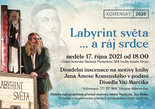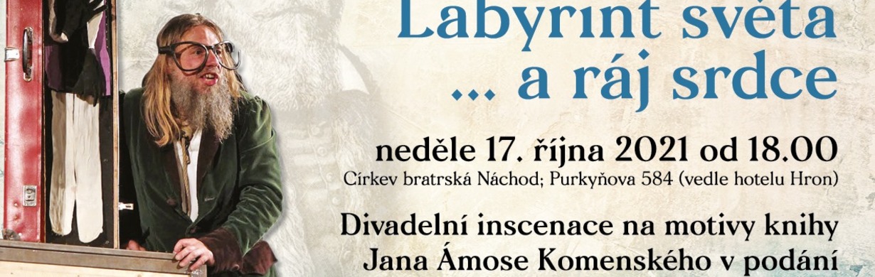 Město Náchod a Církev bratrská Náchod Vás srdečně zvou na divadelní inscenaci na motivy knihy Jana Ámose Komenského "Labyrint světa a ráj srdce" v podání Divadla Víti Marčíka, která se uskuteční v neděli 17. října 2021 od 18 hodin v prostorách Církve bratrské v Náchodě.