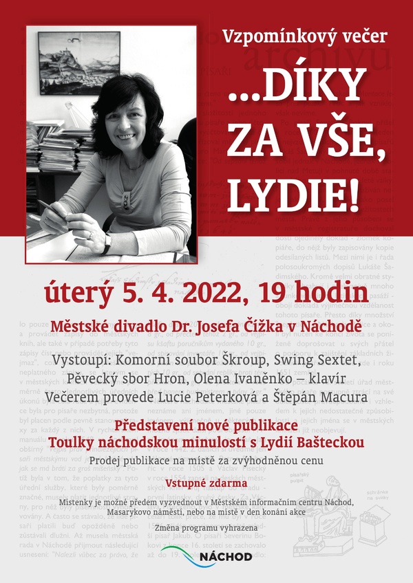 Srdečně zveme širokou veřejnost v úterý 5. dubna 2022 v 19 hodin do Městského divadla Dr. J. Čížka - Beránek Náchod, kde se uskuteční večerní program věnovaný tvorbě a stále živému kulturnímu i historickému odkazu paní Lydie Baštecké, která nás v loňském roce náhle opustila.