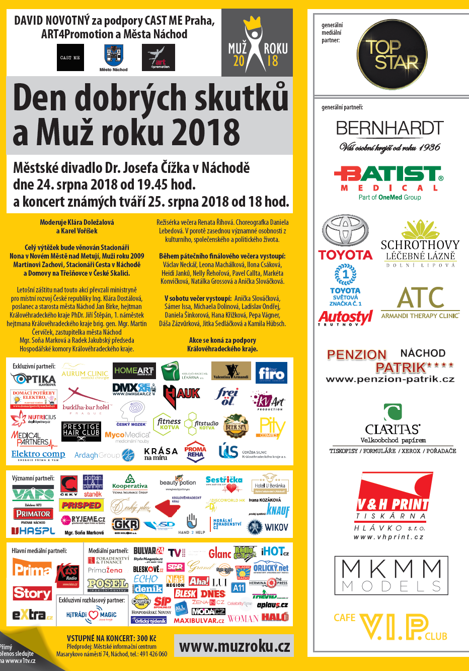 Muž roku 2018 24. 08. 2018 - 24. 08. 2018 David Novotný za podpory CAST ME Praha, ART4Promotion a města Náchod pořádá akci Muž roku 2018. Akce se koná od 19:45 hodin. Předprodej vstupenek v MIC Náchod. Soubory ke stažení 25692_8402910355.png