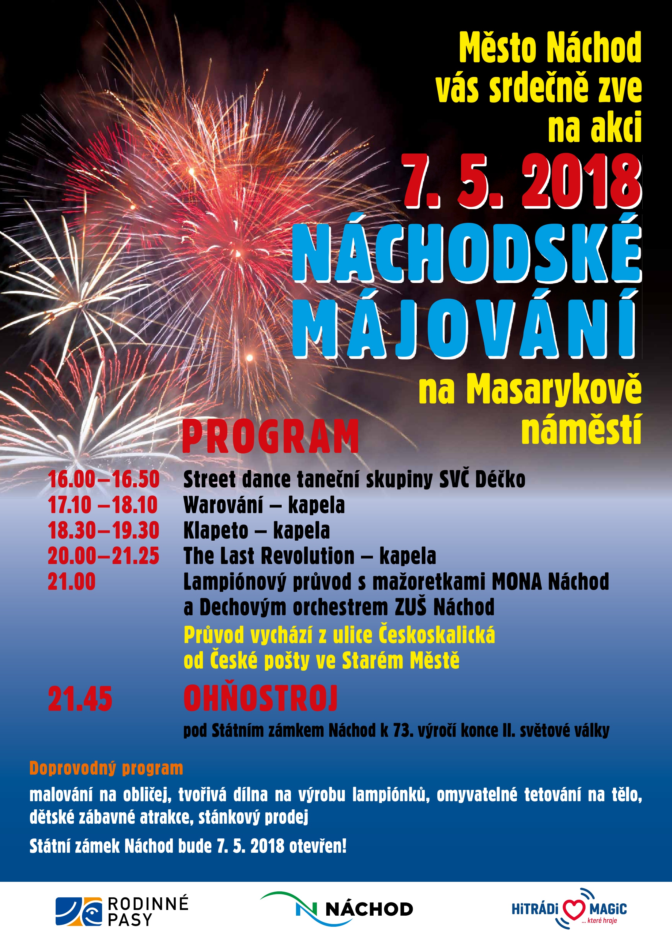 Město Náchod vás zde na Náchodské Májování, které se koná v pondělí 7. 5. 2018 na Masarykově náměstí.