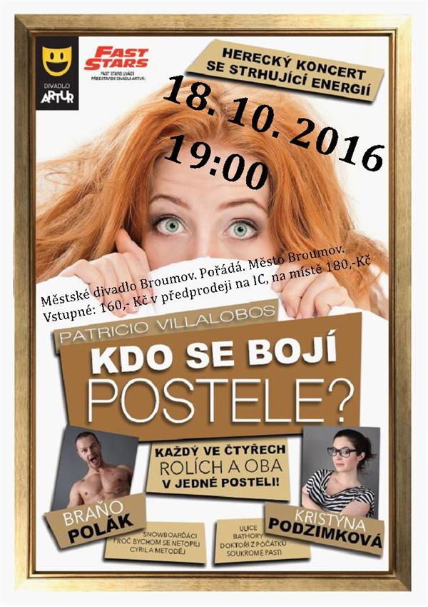 Kdo se bojí postele 18. 10. 2016 - 18. 10. 2016 Městské divadlo Broumov. 18.10. 2017 od 18 hod. Vstupné v předprodeji (IC Broumovska) za 160,-, na místě 180,-. Soubory ke stažení Image.jpg