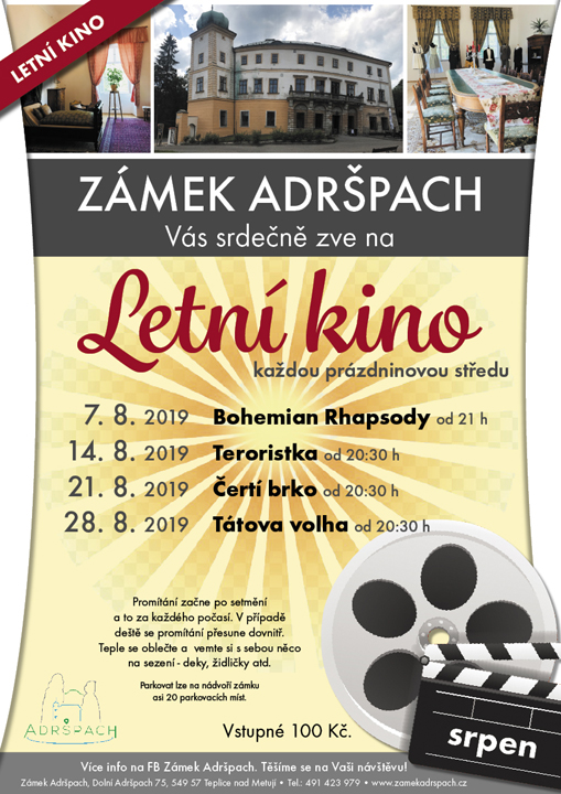 Letní kino v zámecké zahradě v Adršpachu - každou srpnovou středu od 20,30. Pozor 7.8. promítáme od 21 hod.