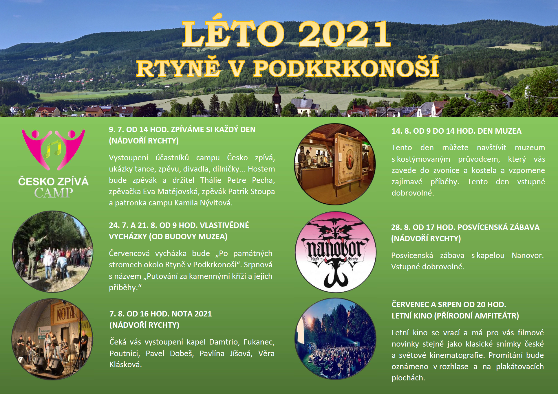 Nota 2021 07. 08. 2021 - 07. 08. 2021 Od 16:00 se na nádvoří Rychty ve Rtyni v Podkrkonoší můžete těšit na vystoupení kapel Damtrio, Fukanec, Poutníci, Pavel Dobeš, Pavlína Jíšová, Věra Klásková. Soubory ke stažení Plakát