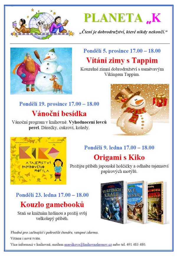 Akce pro děti v Městské knihovně E. Hostovného v Hronově 05. 12. 2016 - 23. 01. 2017 Pozvánka na akce do Městské knihovny Egona Hostovského v Hronově více informací na: www.knihovnahronov.cz Soubory ke stažení Knihovna - PlanetaK.JPG