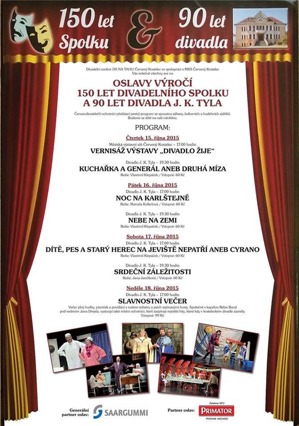 Divadelní soubor DS NA TAHU ve spolupráci s MKS vás srdečně všechny zve na oslavy 150 letspolku a 90 let našeho divadla. V říjnovém čase vám červenokostelečtí ochotníci představí pestrý program, který si pro vás připravili. Můžete se těšit nejen na spoustu zábavy, ale i na spoustu kulturních a hudebních zážitků. Budeme se těšit na vaši návštěvu. Všechny akce vyjma výstavy se konají v Divadle J. K. Tyla.