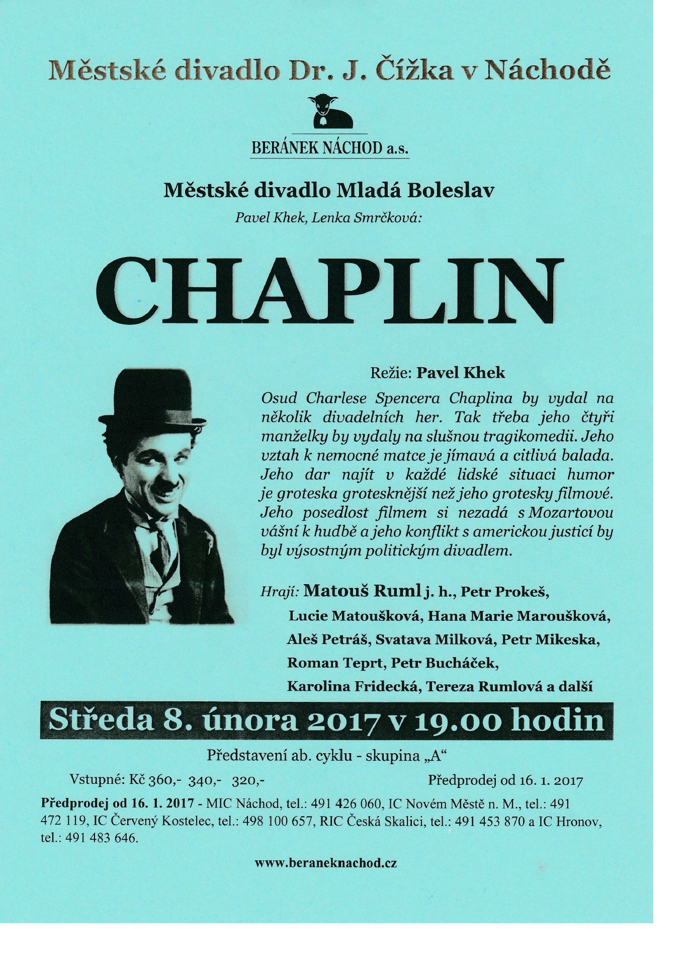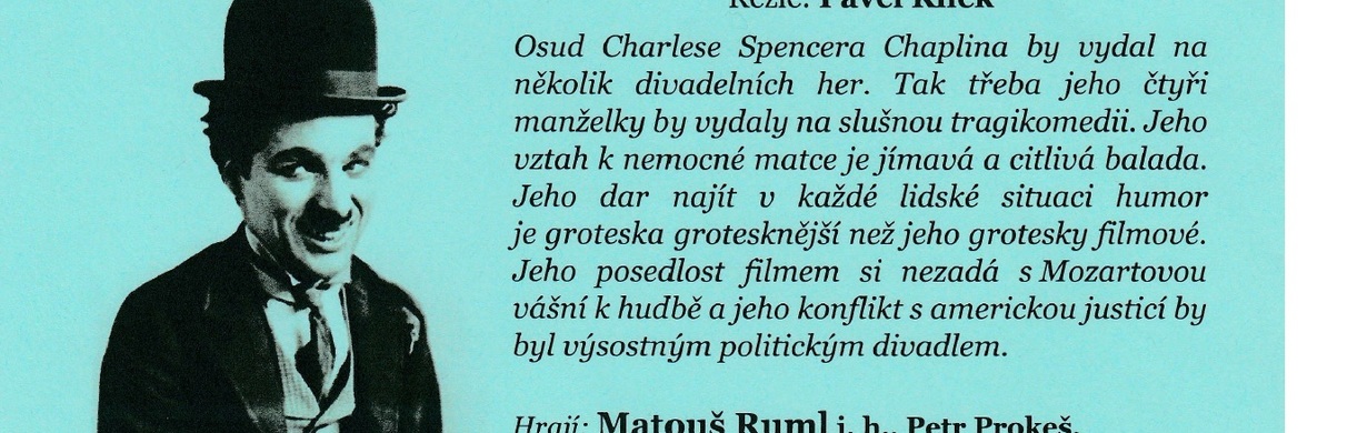 Osud Charlese Spencera Chaplina by vydal na několik divadelních her. Tak třeba jeho čtyři manželky by vydaly na slušnou tragikomedii. Jeho vztah k nemocné matce je jímavá a citlivá balada. Jeho dar najít v každé lidské situaci humor je groteska grotesknější než jeho grotesky filmové. Jeho posedlost filmem si nezadá s Mozartovou vášní k hudbě a jeho konflikt s americkou justicí by byl výsostným politickým divadlem. Chaplinův život jakoby mapoval pohnuté osudy 20. století a člověk si klade otázku: "Co má dělat umělec v tomto přízemním světě?", nebo lépe "Co má dělat člověk v odlidštěném světě?"