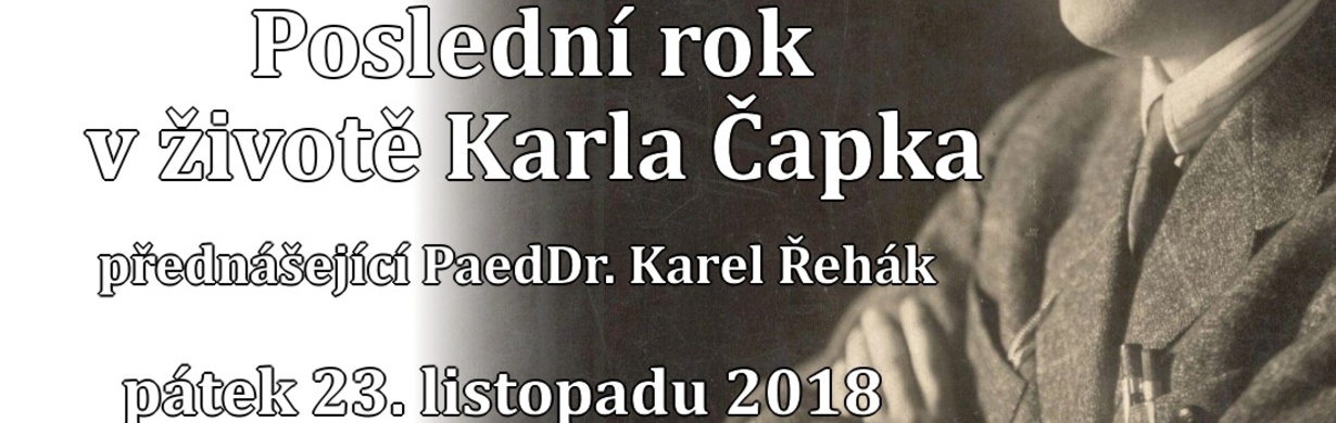 Společnost bratří Čapků a obec Malé Svatoňovice Vás zvou na přednášku pro veřejnost Poslední rok v životě Karla Čapka. Přednášející PaedDr. Karel Řehák. Pátek 23. 11. 2018 v 17 hodin, malý sál kulturního klubu v Malých Svatoňovicích. Vstupné zdarma.