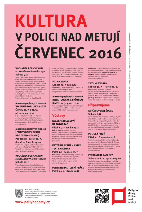 Přehled kulturních a společenských akcí v červenci 01. 07. 2016 - 31. 07. 2016 V přehledu najdete přehle kulturních a společenských akcí konaných v červenci v Polici nad Metují. Srdečně Vás zveme.